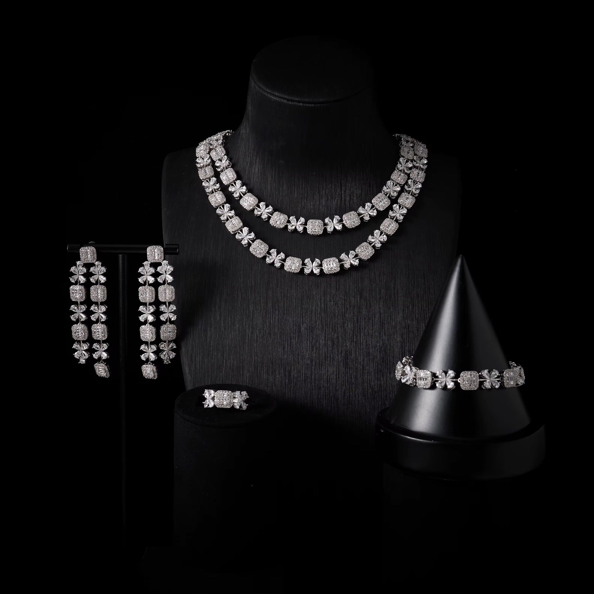 تجمع هذه المجموعة الفاخرة من الزركون المطلية بالذهب بين الرقي والبريق الساحر. صُممت بدقة متناهية لتمنحكِ إطلالة فخمة تعكس روعة الألماس الأصلي، فهي تجمع بين المواد الفاخرة والراحة المطلقة لتجربة لا تشوبها شائبة.