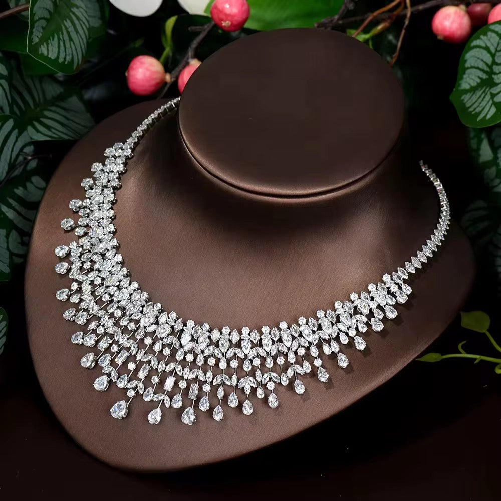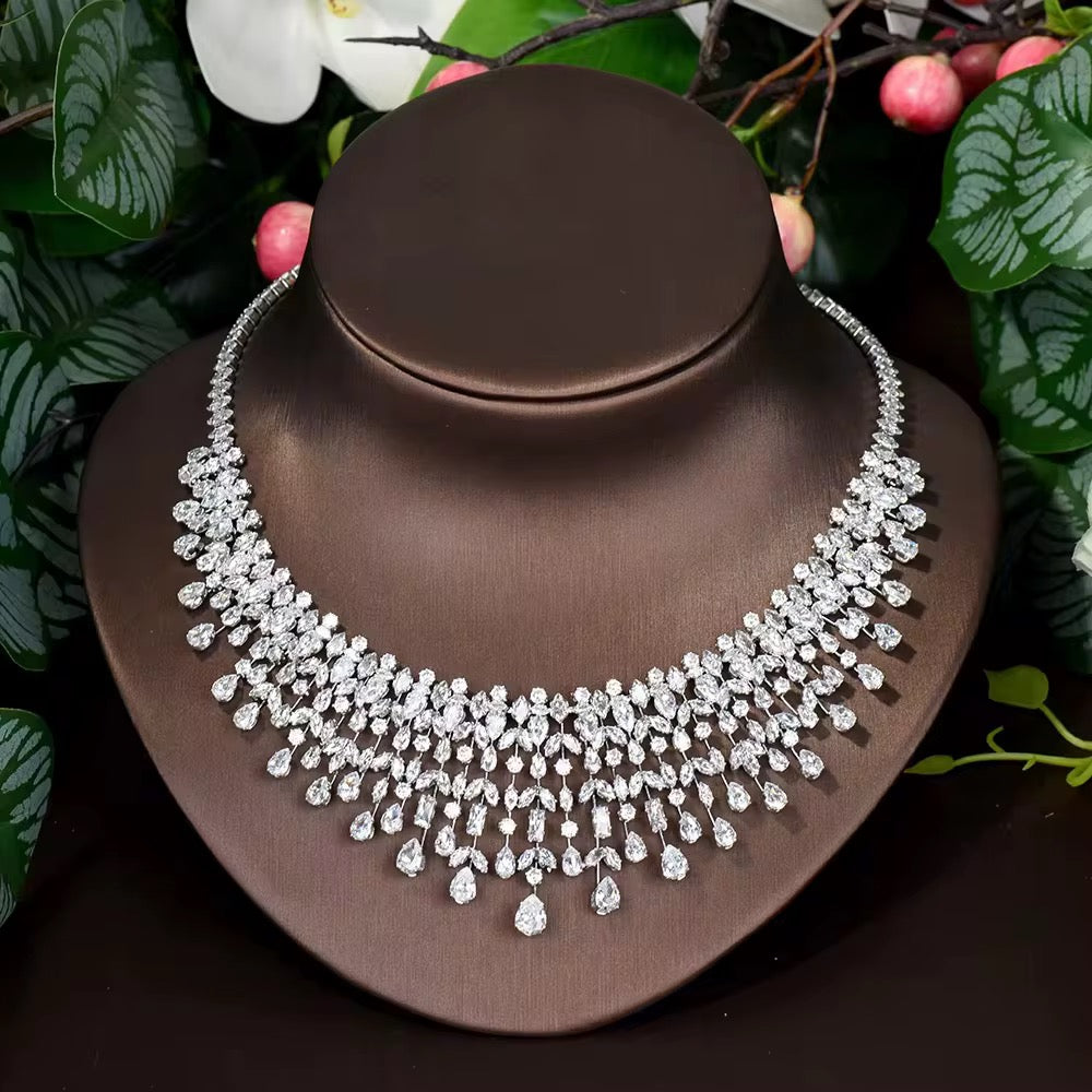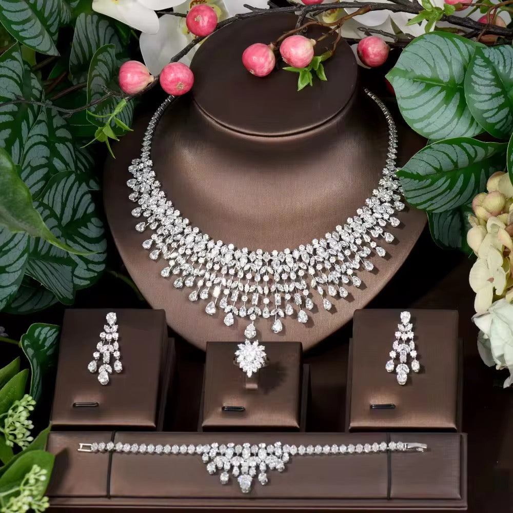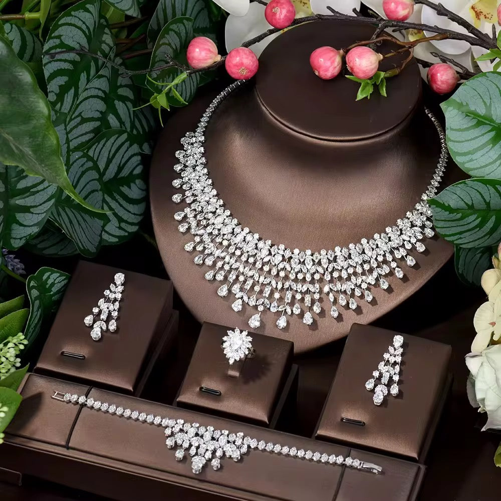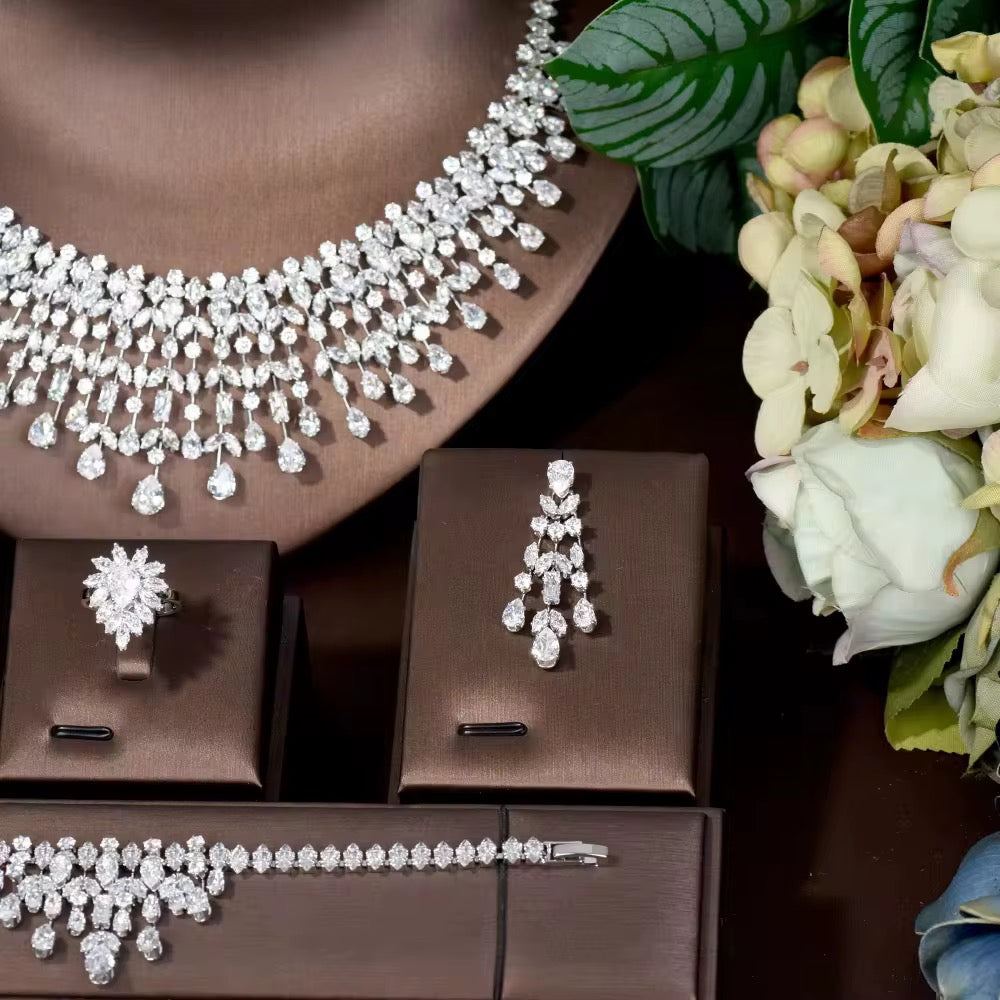 استمتعي بأناقة خالدة مع طقم مجوهرات الزركون الفاخر هذا ، المصمم بدقة متناهية ليعكس بريقاً يشبه بريق الألماس . إنه مزيج مثالي من الرقة والجمال الراقي ، مما يجعله قطعة لافتة للنظر وأنيقة في الوقت نفسه، تناسب جميع المناسبات.