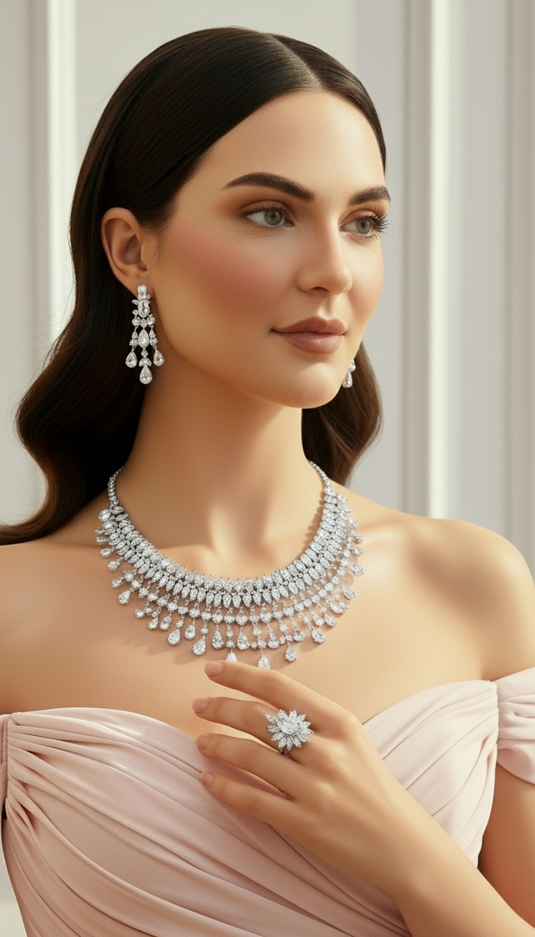 طقم مجوهرات زركون فاخر ببريق يشبه الألماس - مطلي بالذهب الأبيض، مضاد للحساسية