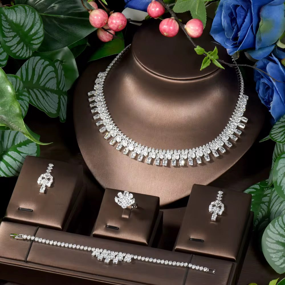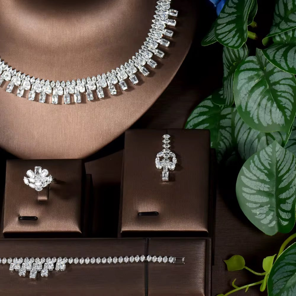 ارتقِ بأناقتك مع طقم مجوهرات الزركون الرقيق والفاخر هذا، المصنوع ببريق استثنائي يعكس بريقًا يشبه بريق الماس - آسر وراقي دون أن يكون مبالغًا فيه.