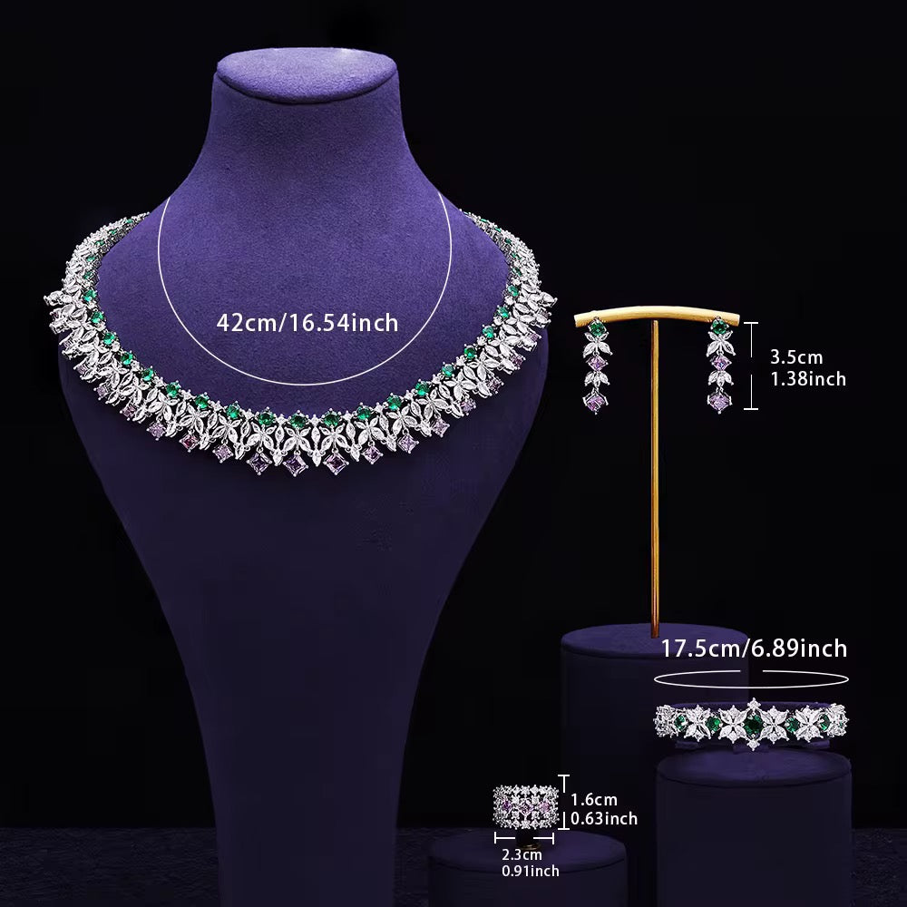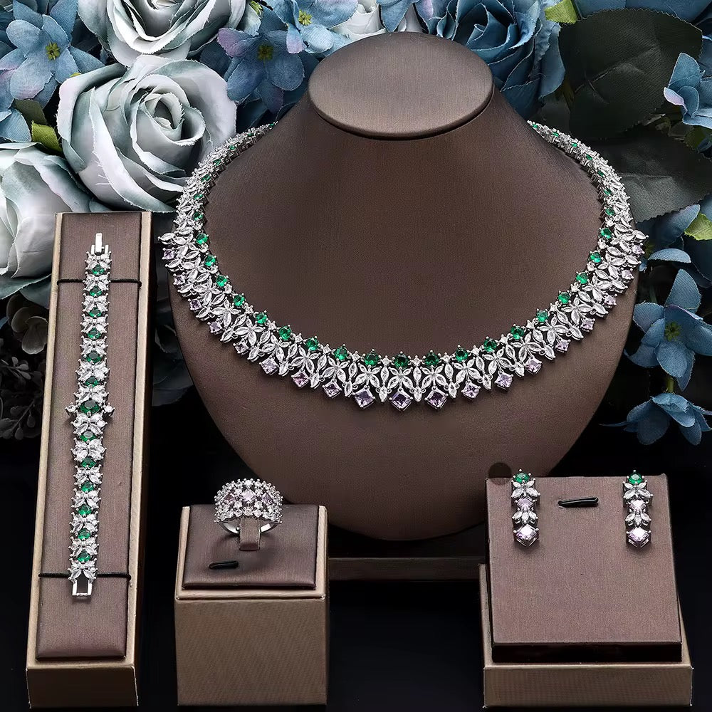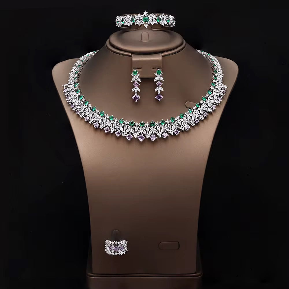 • الطقم الكامل: يتكون من 4 قطع (عقد ياقة، أقراط متدلية، سوار أنيق، وخاتم كوكتيل).